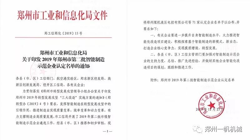 導讀: 近日,鄭州市工業和信息化局傳來喜訊,鄭州一帆機械設備有限公司入選“2019年鄭州市第二批智能制造示范企業認定”名單,成為鄭州市2019年被認定的“智能制造示范企業”。