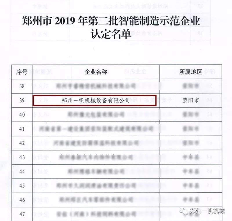 近日,鄭州市工業和信息化局傳來喜訊,鄭州一帆機械設備有限公司入選“2019年鄭州市第二批智能制造示范企業認定”名單,成為鄭州市2019年被認定的“智能制造示范企業”。