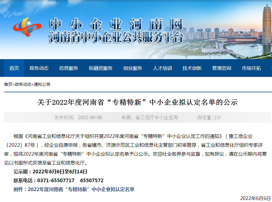 近日,河南省中小企業公共服務平臺對2022年度河南省“專精特新”中小企業擬認定名單進行公示。
