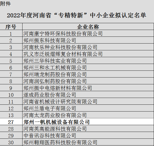 根據《河南省工業和信息化廳關于組織開展2022年度河南省“專精特新”中小企業認定工作的通知》,經企業自愿申報,各地工業和信息化主管部門初審推薦,省工業和信息化廳組織專家評審認定,鄭州一帆機械設備有限公司憑借專業的技術與研發能力成功入選2022年度河南省“專精特新”企業名單。