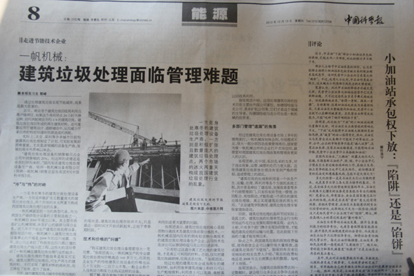 近日,南京建筑垃圾回收再利用點落戶建鄴區,如果這個再利用點24小時不停運轉,則可消耗南京市約1/4的建筑垃圾。建筑垃圾處理后形成的再生建筑材料,還可重新應用于建筑設計、道路鋪設中,從而減少開采自然材料對環境和資源造成的消耗。 實際上,北京、深圳等許多城市目前均就建筑垃圾處理制定了計劃,可實際發展卻困難重重。尤其是該領域的設備生產商,發展的艱辛外界難以體會。“建筑垃圾處理設備的銷售額只占全公司年銷售額的25%,而這樣的成績還是辛苦打拼而來的。”國內知名建筑垃圾處理設備生產商,鄭州一帆機械設備有限公司(簡稱一帆機械)銷售總監張現團對《中國科學報》說。